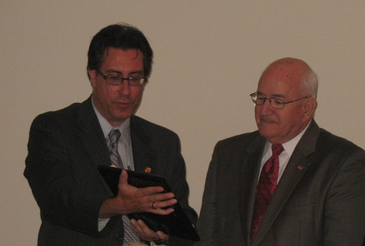 Pennsylvania Sen. Roger Madigan was presented with a Transportation Advocate Award by Route 15 Coalition president Mark Murawski, left, and Appalachian Thruway Association president O. Richard Bartlett during the 2008 annual meeting of the two organizations.