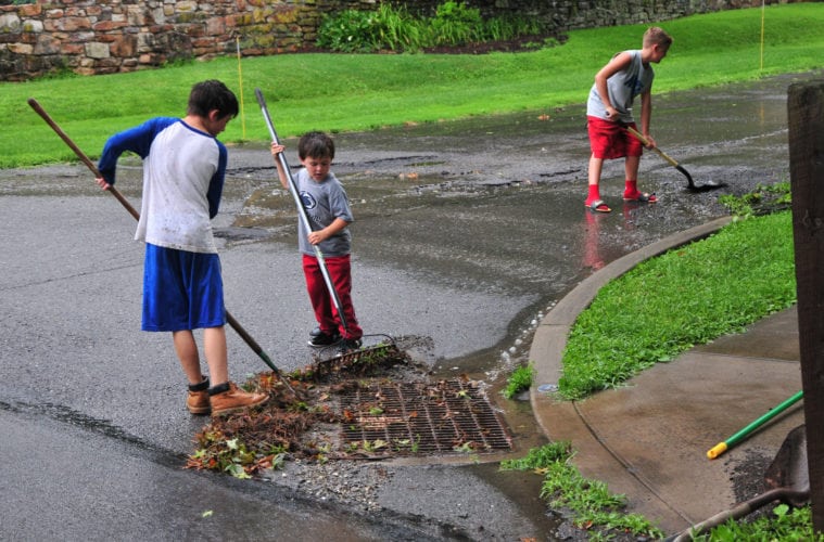 Rory Peters, 10, left, Chance Fox, 6, middle, and Braden Fox, remove debris from storm grates and keep the water flowing on Highland Terrace after a downpour Monday. Chance and Braden are the sons of Michael and Lexi Fox, and Rory is the son of Kelly Travis and Andrew Peters, all of Williamsport.