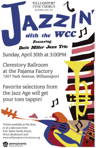 The Williamsport Civic Chorus is delighted to present “Jazzin’ with the WCC,” accompanied by the Dave Miller Jazz Trio, at 3 p.m. Sunday, April 30, in the Clerestory Room at the Pajama Factory, 1307 Park Ave.