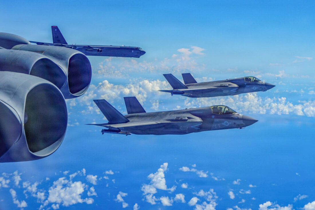 In this image provided by the U.S. Air Force, a Air Force B-52H Stratofortress bomber flies with Marine Corps F-35B Lightning II aircraft in the U.S. Southern Command area of responsibility, Oct. 15, 2025. (U.S. Air Force via AP)