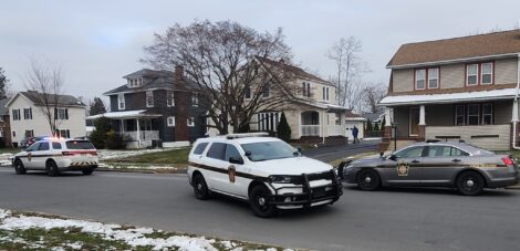 PHILIP A. HOLMES/Sun-Gazette At least three state troopers responded to Saturday's accident in Loyalsock Township where a pickup truck crashed into a home on Faxon Parkway.