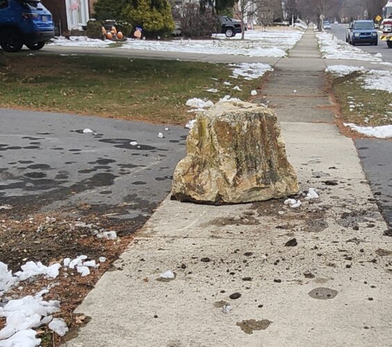 This small bolder moved a few feet and landed on the sidewalk after being struck by a pickup truck on Faxon Parkway on Saturday afternoon. The crash occurred just south of Meade Street in Loyalsock Township. The driver of the truck suffered an apparent medical episode, fire officials said.