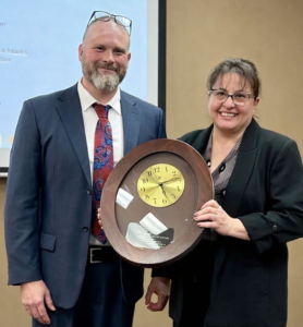 Outgoing LLA President, Judge Ryan Gardner, passes the “presidential gavel” to Attorney Jeana Longo. PHOTO PROVIDED