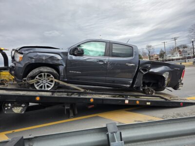 The GMC sustained heavy damage, including the loss of a rear passenger tire, and was removed by Freedom Towing.