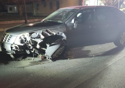 The Bucks County driver of this Cadillac escaped injury Saturday night, but his car sustained extensive damage when it struck three parked vehicles in the 600 block of West Fourth Street, city police said. PHILIP A. HOLMES/Sun-Gazette