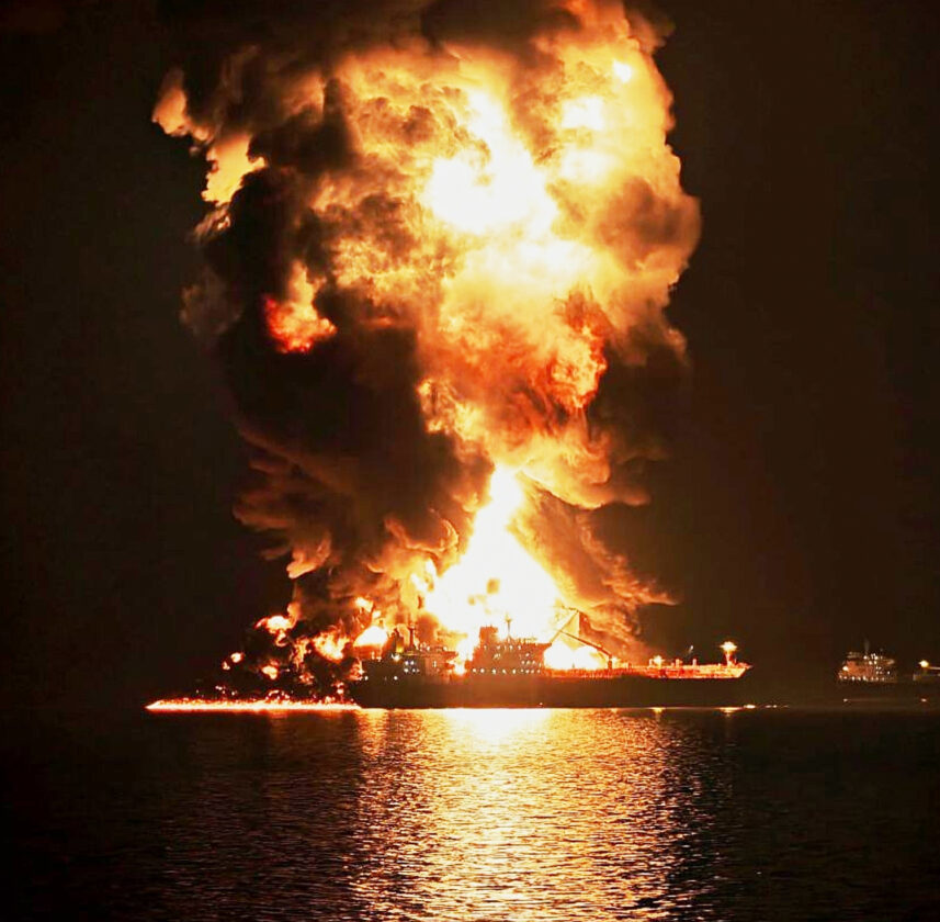 An oil tanker burns after being hit by an Iranian strike in the ship-to-ship transfer zone at Khor al-Zubair port near Basra, Iraq, late Wednesday, March 11, 2026. (AP Photo)