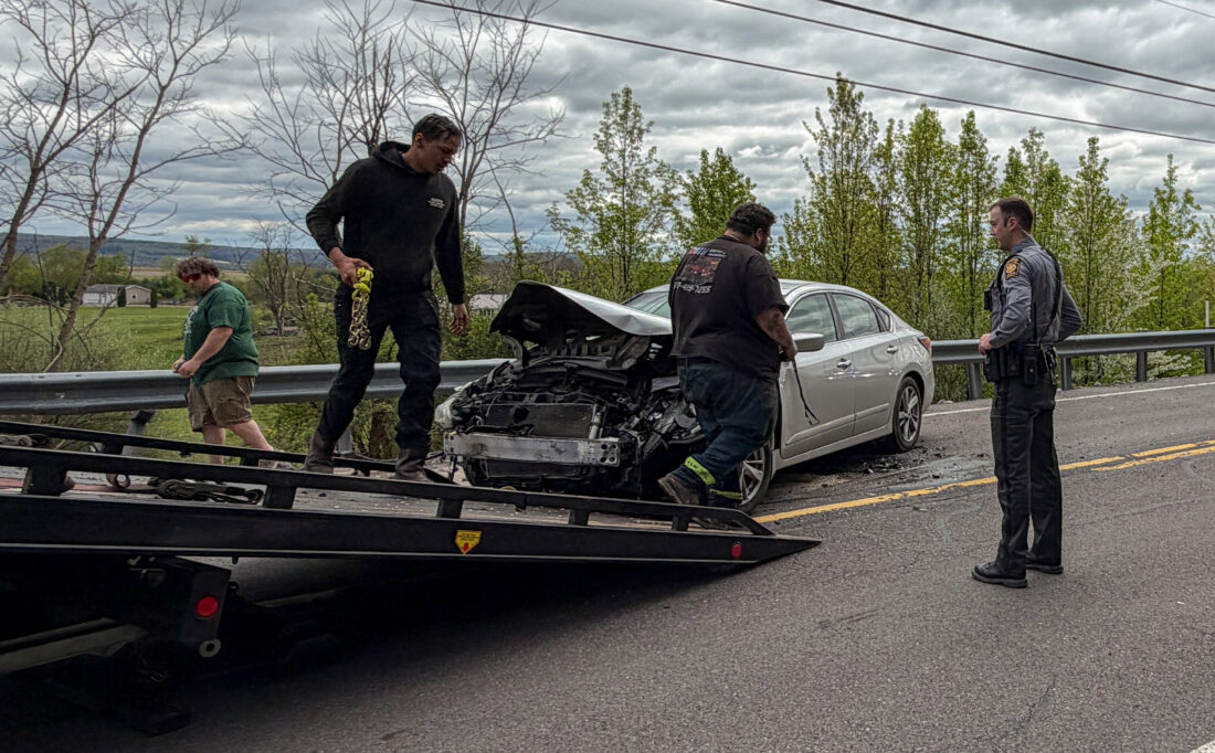 State Police watch as the wreckage of a car is removed from Route 220 Sunday afternoon. The one-car accident was reported about 1:30, there was no driver at the scene when first responders arrived. DAVE KENNEDY/Sun-Gazette