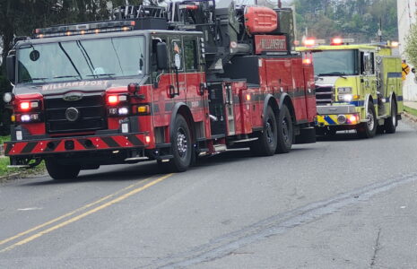 - City fire trucks line Arch Street after firefighters were dispatched to a crash at Lincoln Street early Saturday afternoon. PHILIP A. HOLMES/Sun-Gazette