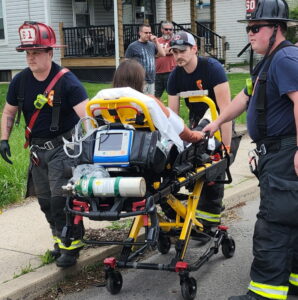 - City firefighters transport a woman to a waiting ambulance at Saturday’s crash on Arch Street. Police said her injuries did not appear to be serious. PHILIP A. HOLMES/Sun-Gazette