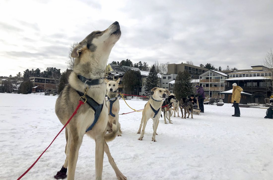 Sled dogs prepare to take a tourist for a ride on the frozen surface of Mirror Lake near Main Street on Friday, Jan. 31, 2020, in Lake Placid, N.Y. The surge in the number of short-term rentals in this Adirondack Mountain resort is alarming local residents who fear it is changing the character of the village. (AP Photo/Michael Hill)