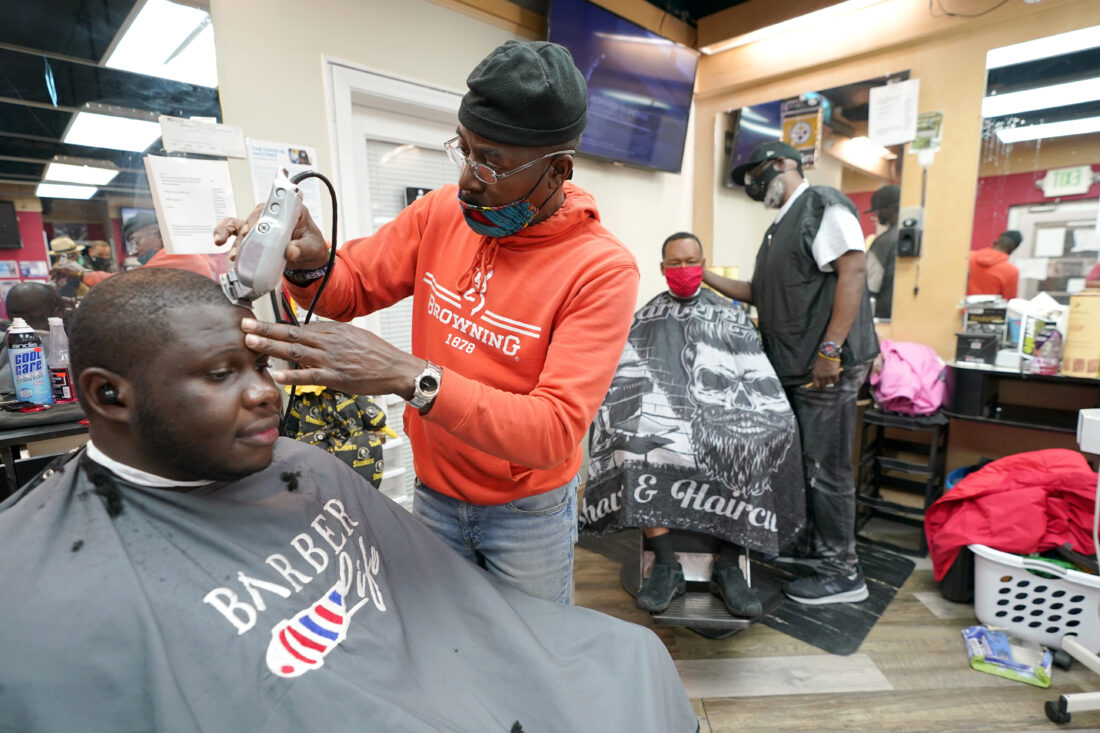 ASSOCIATED PRESS Kevin Fitzhugh, center left, cuts the hair of Mabreco Wright, left, as Wallace Wilson, right, cuts the hair of James McRae in April in the neighboring state of Maryland. In Pennsylvania the state Legislature is considering a bill to address disparities in how barbershops and salons are treated.