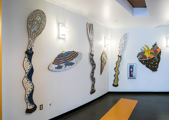 With a central theme of food, the student project came together in the spring of 2016. Stabley and his students designed and created six large-scale mosaic pieces: a spoon, a fork, a knife, a plate of pancakes, an ice cream cone and a bowl of colorful fruit. Each piece was created using an array of ceramic and glass tiles.