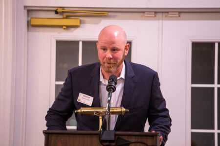 Joe Feerrar speaks after receiving the Lycoming College Alumni of the Year award at the Williamsport/Lycoming Chamber of Commerce Education Celebration at the Williamsport County Club. Feerrar is a member of the Lycoming College Class of 2002. KAREN VIBERT-KENNEDY/Sun-Gazette