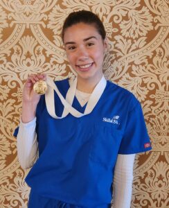 According to the SkillsUSA website, competitors in the basic health care category “demonstrate their knowledge and ability to perform entry-level procedures or skills based on the following list of core standards: academic foundations, communication skills, career opportunity concepts and systems, employability and teamworking, ethical and legal issues and safety practices.” Their performance is “evaluated through various stations involving skills testing as well as written and verbal assessments.”