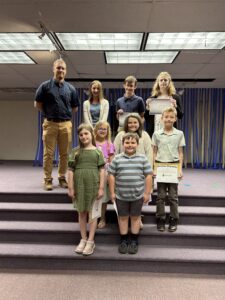 Walnut Street Christian School students grades 5 through 12, tested against top KCEA students across the state and were recognized for their high achievements. Superior is the highest award, and students from WSCS received trophies in this award for elementary geography and history as well as senior high spelling. Excellent is the next highest award and students received this trophy in elementary and junior high science, as well as senior high English. The Merit award is another award received and students earned medals in elementary science, junior high geography and history and research poetry and senior high English, geography and history and spelling. Honorable mention is the last award given and students received ribbons in elementary Bible, English, spelling and math, junior high English, geography and history and math and senior high extemp. essay, geography and history, math and spelling. In the front row from left are Elijah Rinker, Sydney Kennedy, Gabriel Winkleman, Hannah Schildroth, Keegan Tomb, Evelynne Krick and Thomas Barrett. In the second row from left are Adrienne Zollitsch and Lauren Baker and in the back row from left are Bruce Thomas, Oakton Rosypal, Clark Thomas, Nate Barrett, Acer Rosypal, Micah Borowicz, Dominic Brooks and Danielle Miller. Students who received the Christian Character Award stand together for a photo. The Christian Character Award is chosen by the teacher and goes to the student who has shown good conduct throughtout the year as well as exemplifying Christ in their attitude, in their hard work and in their daily service to others. In the front row from left are Ella Hunter and Wyatt Tomb; in the second row from left are Annalise Snyder, Rebekah Henderson and Carson Brooks; and in the back row from left are Principal Mr. Tom Krick, Lauren Baker, Dominic Brooks and Danielle Miller.