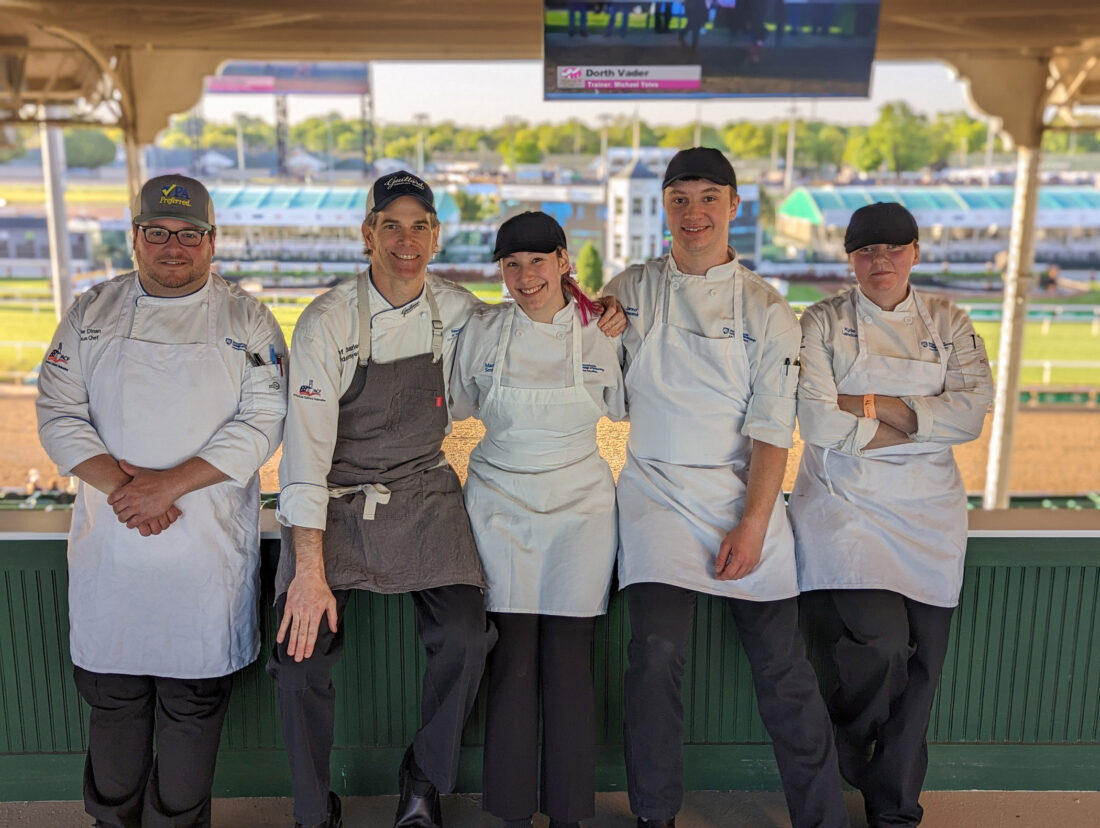 Pennsylvania College of Technology employees and students pause for a photo at the storied Churchill Downs race track, site of the Kentucky Derby, during Derby Week in 2023. Penn College business and hospitality students are again set to complete Derby Week internships at the facility. From left, Chef Mike S. Dinan, executive chef of the college’s Le Jeune Chef Restaurant; Chef Charles R. Niedermyer, instructor of baking and pastry arts/culinary arts; and then-culinary-arts-technology students Maddi H. Smith, Jared D. Schwenk and Kylie R. Landon.