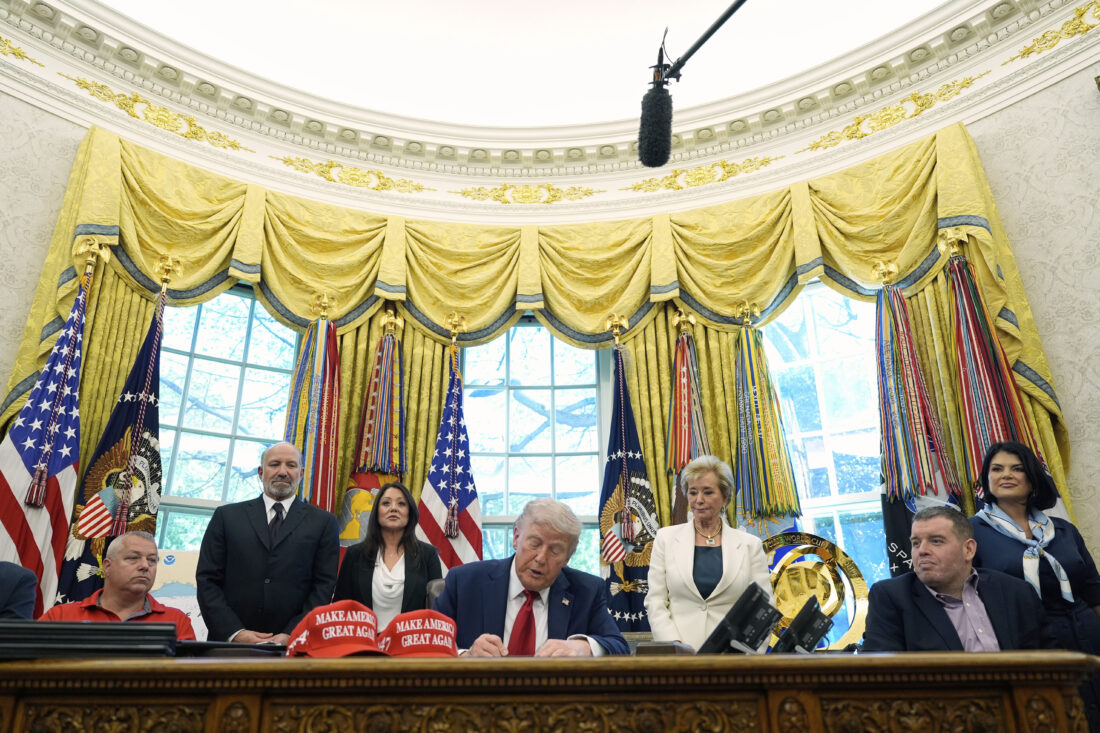 President Donald Trump signs an executive order regarding education in the Oval Office of the White House, Wednesday, April 23, 2025, in Washington, as Commerce Secretary Howard Lutnick, Labor Secretary Lori Chavez-DeRemer and Education Secretary Linda McMahon watch. (AP Photo/Alex Brandon)