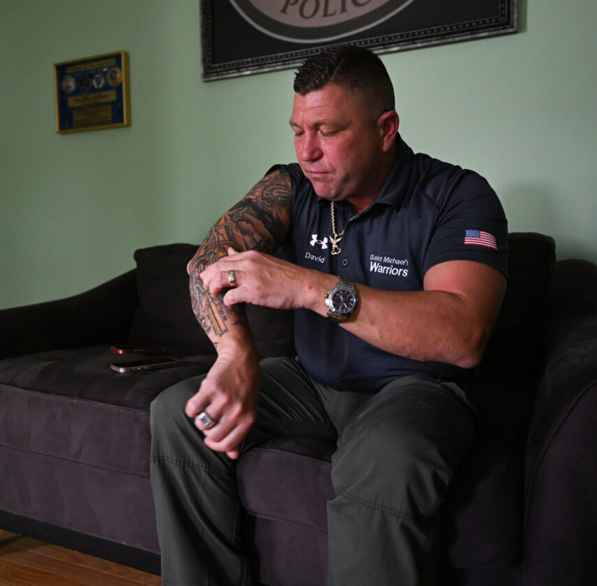 David Alercia, a former Slatington police officer who was wounded in the line of duty, is seen Monday, Aug. 28, 2023, in his home in Forks Township. Alercia has started St. Michael's Warriors, "an experience-based group created to guide first responders, veterans, active-duty military and their families through difficult times." The group helps those struggling with post-traumatic stress disorder, substance abuse and mental health challenges. (Amy Shortell/The Morning Call)
