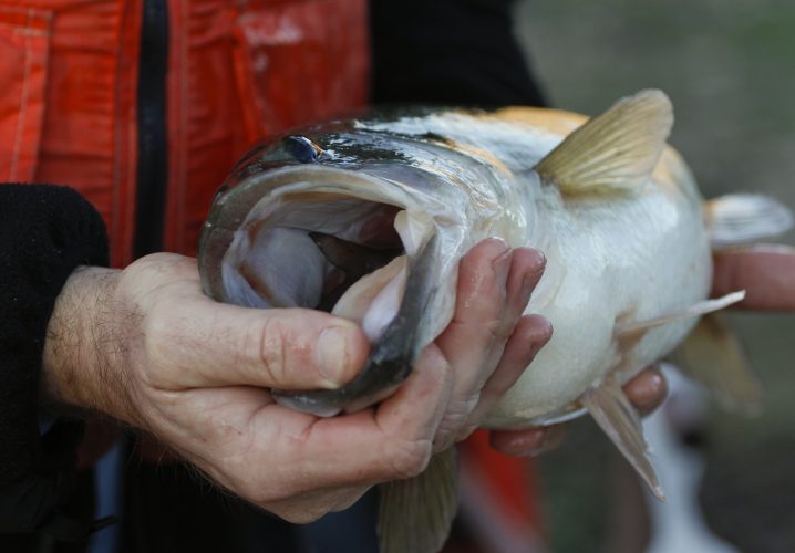 TVA biologist John Justice points out how a largemouth bass recently ate a Threadfin Shad, whose tail is barely visible within its mouth, while participating in an annual sport fish survey on the Chickamauga Reservoir near Harrison Bay’s Wolftever boat ramp Tuesday morning, March 19, 2013 in Hamilton County, Tenn. (AP Photo/Chattanooga Times Free Press, Dan Henry) THE DAILY CITIZEN OUT; NOOGA.COM OUT; CLEVELAND DAILY BANNER OUT; LOCAL INTERNET OUT