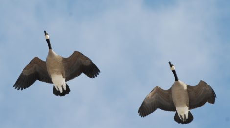 While shoveling snow, I heard a flock of Canada geese going over. I looked up and saw the geese in the familiar “V” pattern and they were flying quite high and moving fast. I wondered why these geese were going south so late. Within the next hour, I heard and saw six large flocks of Canada geese winging over. The next day, while still shoveling out, I heard geese again. This time I observed five flocks of geese heading south.