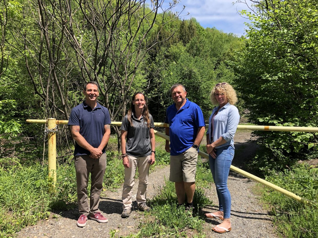 PHOTO PROVIDED Blossburg Mayor Shane Nickerson joined Renee’ Carey with the Northcentral Pennsylvania Conservancy and John Brown and Cindy Ridall with KLJ Enterprises at the property to celebrate the progress with restoring the Tioga River. The Northcentral Pennsylvania Conservancy purchased the property from KLJ Enterprises, Inc., with funding provided by the Susquehanna River Basin Commission.