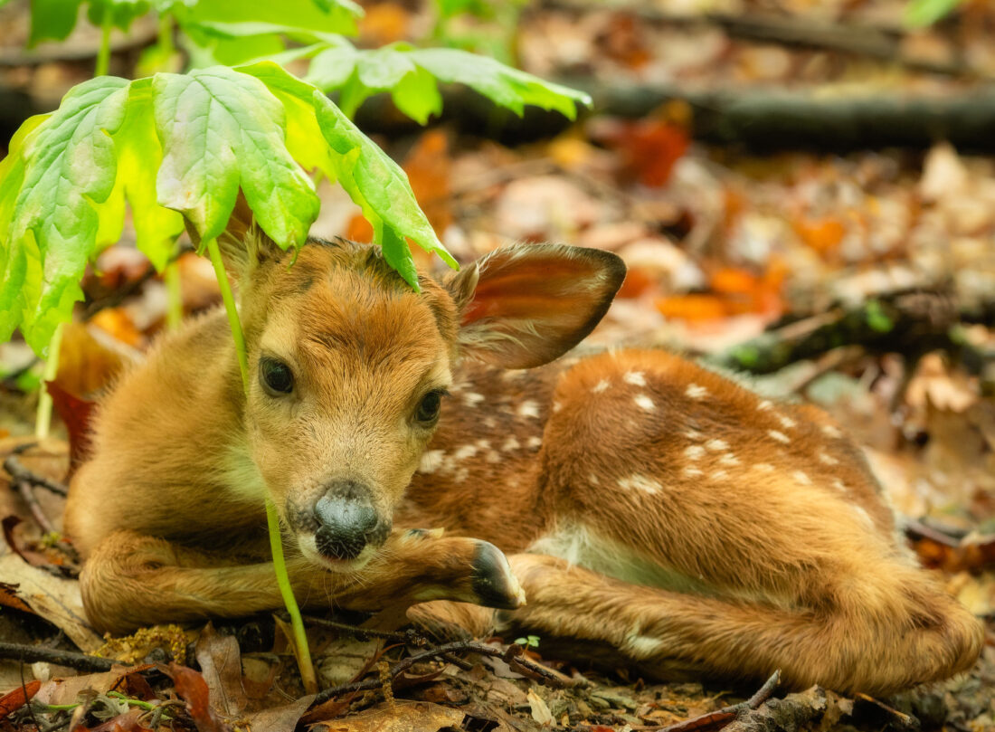 - PHOTO PROVIDED Shown is a fawn with mayapples resting in the woods in this photo by Mark Boyd.