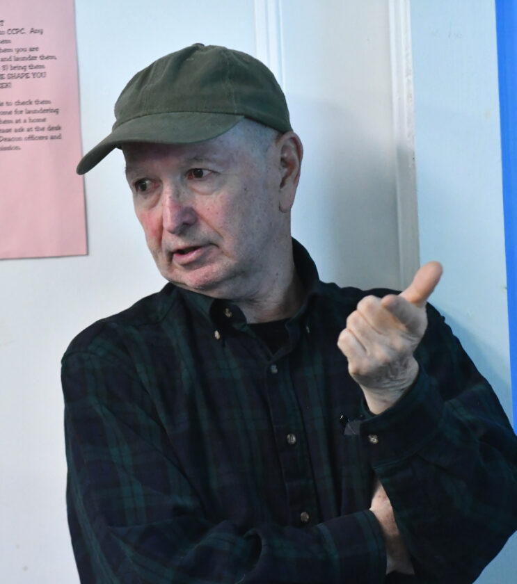 - MARK NANCE/Sun-Gazette Correspondent Rick Kintzner points to his label on one of his reel line cassettes during his presentation of “Considerations when Putting Together a Fly Fishing Outfit” during the monthly Trout Unlimited meeting at Covenant Central Presbyterian Church Wednesday.