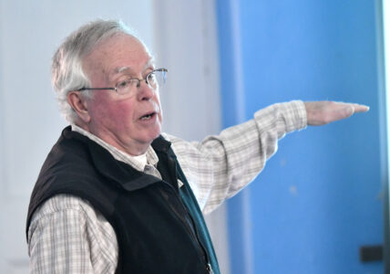 MARK NANCE/Sun-Gazette Correspondent Trout Unlimited board of director Walt Nicholson presents some of his favorite trout fishing spots during the monthly Trout Unlimited meeting at Covenant Central Presbyterian Church Wednesday.