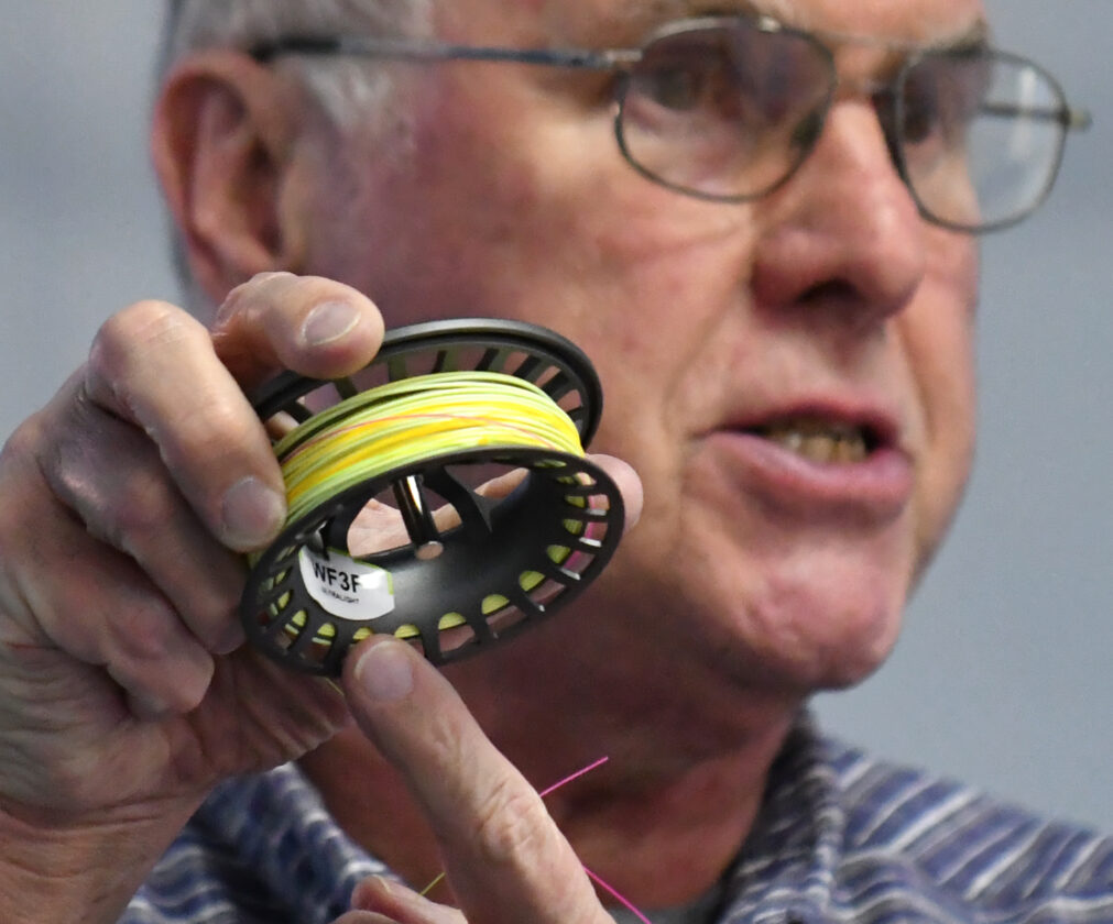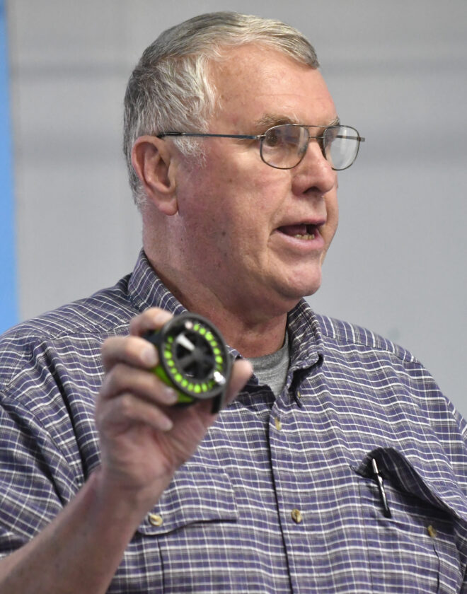 - MARK NANCE/Sun-Gazette Correspondent Rick Kintzner shows off a fly fishing reel which he recommends when considering a fly fishing outfit during the monthly Trout Unlimited meeting at the Covenant Central Presbyterian Church Wednesday. Kintzner presented several items which he recommended in any fisherman’s outfit.