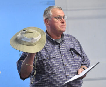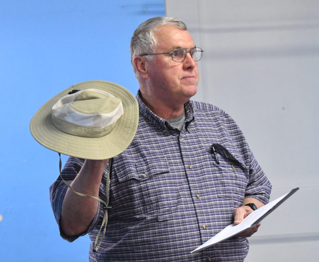 - MARK NANCE/Sun-Gazette Correspondent Rick Kintzner recommends a wide brimmed hat when considering a fly fishing outfit during the monthly Trout Unlimited meeting at the Covenant Central Presbyterian Church Wednesday. Kintzner presented several items which he recommended in any fisherman’s fly fishing outfit.