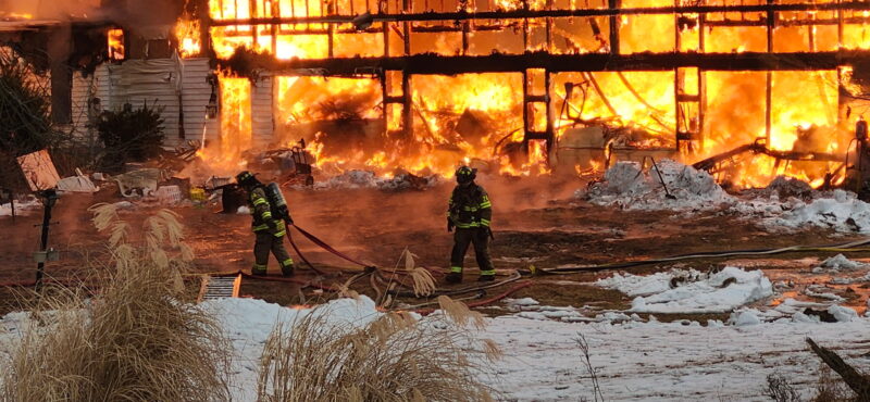 A raging multiple-alarm blaze burned out of control for two hours Monday afternoon at the Gamble Township home of Dr. Raymond Lukas, a retired anesthesiologist, and his wife Susanna. No one was injured in the fire.