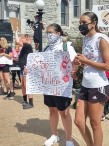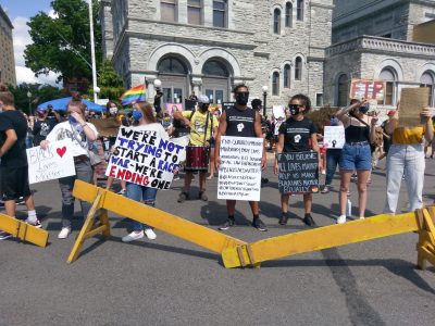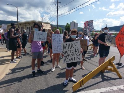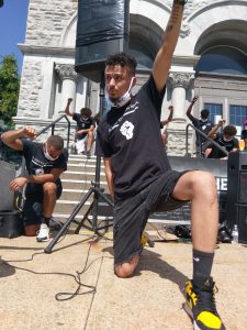 Milton-based activist group “If Not Us, Then Who?” drew together hundreds of protesters, most wearing masks, for a Black Lives Matter rally in front of City Hall on Sunday afternoon. Chants of “If not us, then who? If not now, then when?” and “No justice, no peace” filled the air. Activist Gene Stilp joined the crowd, burning a conjoined Confederate and Nazi flag as well as a Trump flag conjoined with the flag of the former Soviet Union in a trash can amid cheers and applause. Informational booths for the NAACP and to help protesters register to vote were on site. The rally went mobile for a brief march through the city before returning to City Hall. West Street, between City Hall and the Williamsport Water Authority, was closed for the duration of the rally.