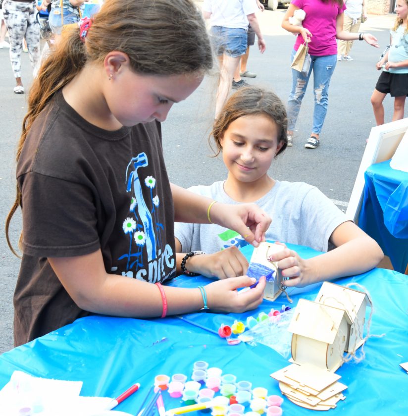 RALPH WILSON/Sun-Gazette Correspondent Kayla Demmien, left, and her sister Mackenzie build and decorate a bird house at the Habitat for Humanity booth during First Friday events in Williamsport. Activities at the Kiwanis Kids Festival included mural painting, crafts and a bounce house within the walls of Mural Canyon.