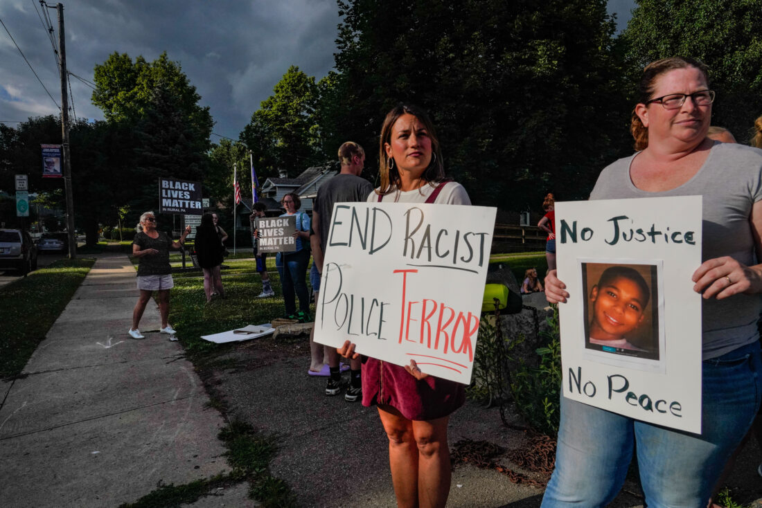 Protestors in front of the Tioga (Pa.) Borough Hall late Wednesday evening July 6, 2022. A group of about 50 people gathered against the hiring of the police officer that shot and killed Tamir Rice in 2014. DAVE KENNEDY/Sun-Gazette