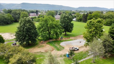 An overhead view shows the beginning of the construction of a Splash Pad in Shaw Place Park in Williamsport. Vortex USA has built and is installing the water feature set to open in summer 2023. The feature has several jets of water that are time controlled. It is being paid for using American Rescue Plan funds. The project was approved by Mayor Derek Slaughter in conjunction with City Council.