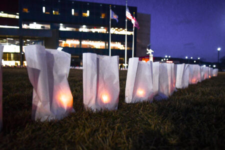 Luminarias arranged in a heart shape are lit during presentation to raise awareness of heart health and love at the UPMC campus on Friday. The Lights of Love event was co-sponsored by UPMC, Lycoming United Way and Sojourner Truth Ministries.