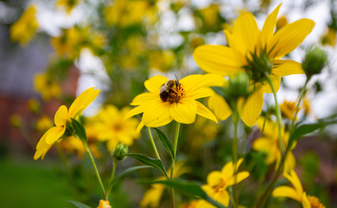 - A bee sits on a flower on a Woodland Sunflower at Way’s Garden on West Fourth St. KAREN VIBERT-KENNEDY/Sun-Gazette