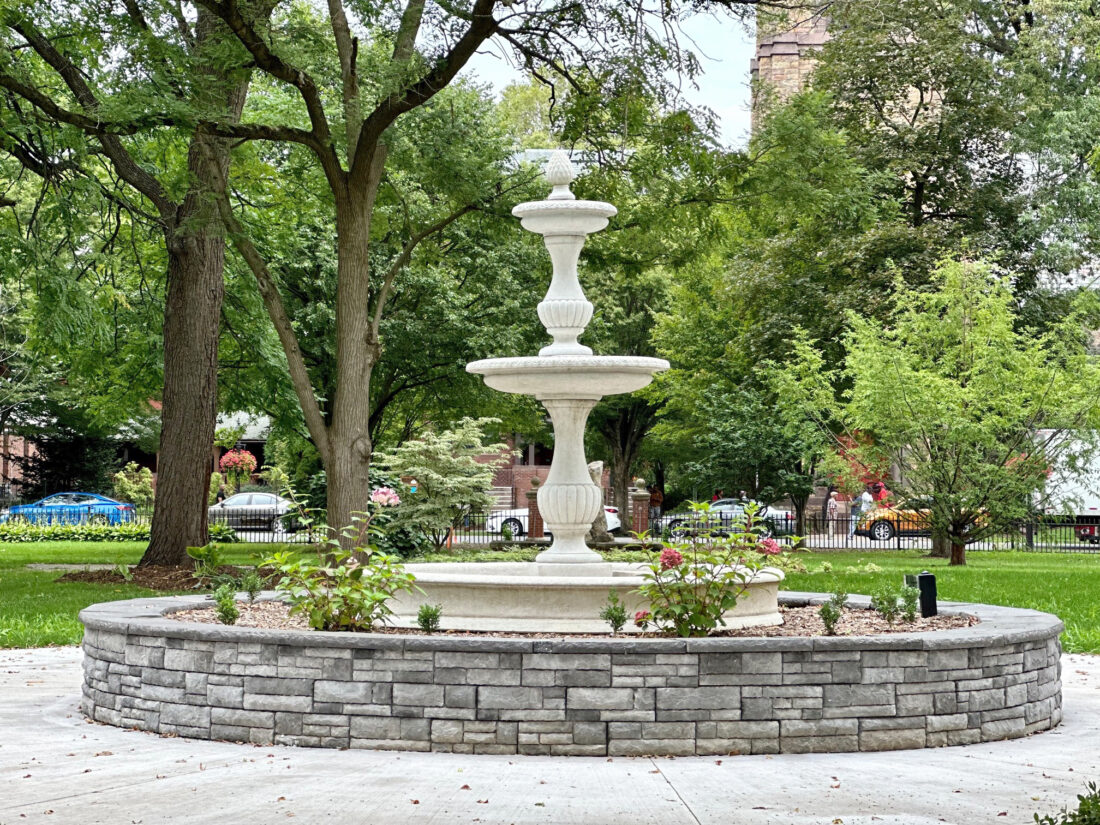 This happens amidst the shade of towering trees and accessible pathways, and the garden features a central white stone fountain encircled by new plantings.