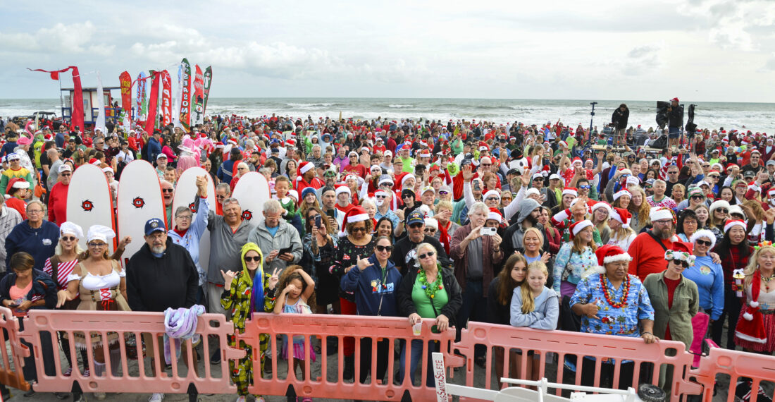 Crowds gather for the Surfing Santa event Christmas Eve morning in Cocoa Beach Fla., on Sunday, Dec. 24, 2023. The tradition started in 2009 when George Trosset and his son, George Jr., went surfing in a Santa suit and an elf costume on Christmas Eve. Friends found out about it and joined them the next year. The event grew each year and now in its 15th year the event attracts thousands and has become a fund raiser for the Florida Surf Museum and Grind for Life, an organization that provides financial assistance to cancer victims. (Malcolm Denemark/Florida Today via AP)