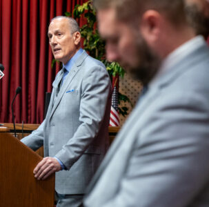 Lycoming County District Attorney Tom Marino talks about the recent homicides that have occured in the county during a press conference Tuesday morning. DAVE KENNEDY/Sun-Gazette