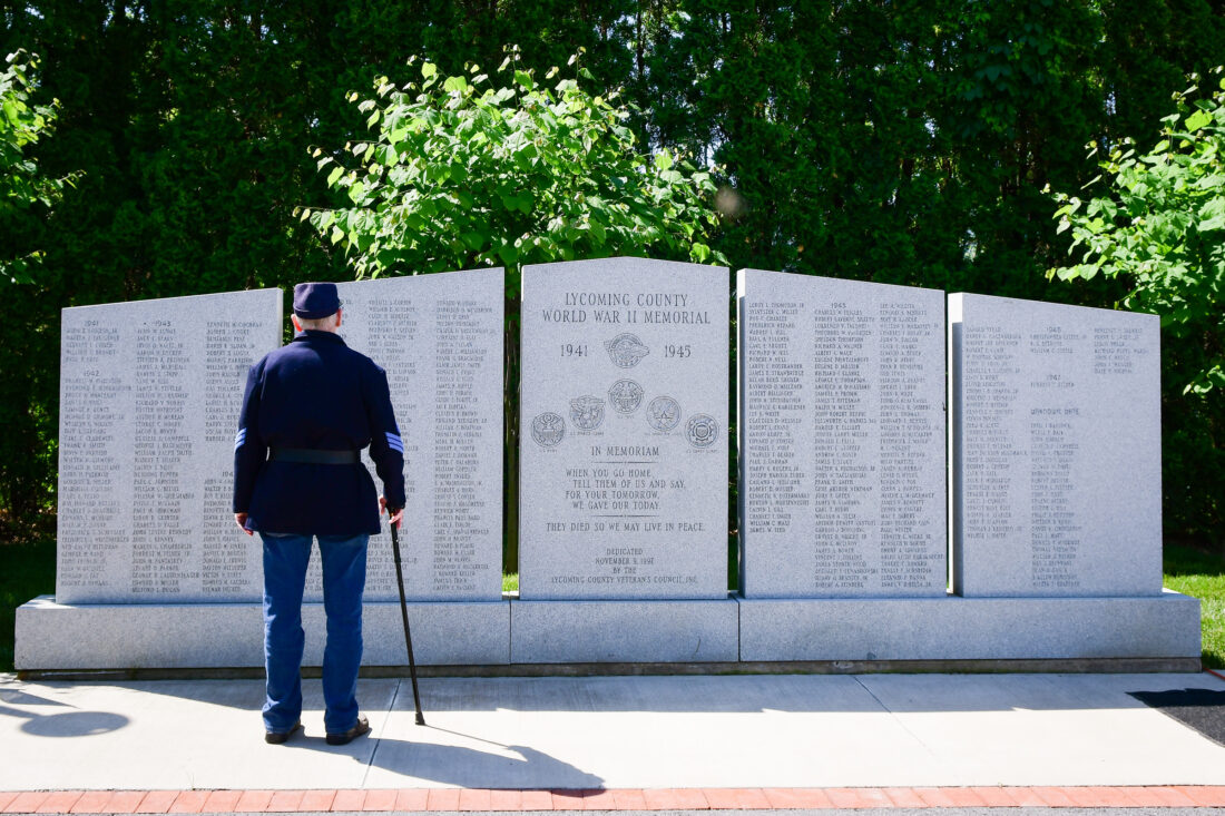 - RALPH WILSON/Sun-Gazette Correspondent Gary Reaser of Williamsport, a former Civil War re-enactor, pauses at the World War II memorial during the annual Memorial Day service at Lycoming County Veterans Park on Saturday, May 25, 2024. Presented by the Lycoming County Veterans Council, Inc., the event featured guest speaker, MG. Mark J. Schindler, Adjunct General of Pennsylvania.