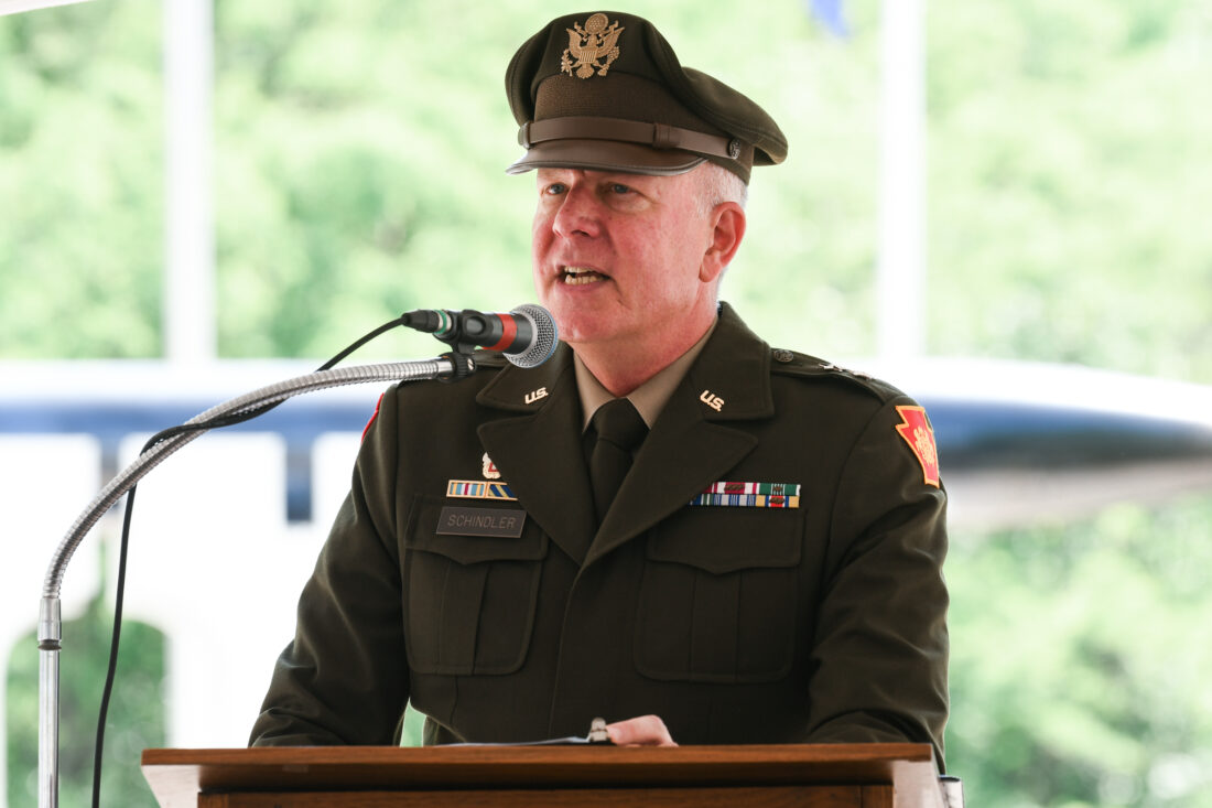 - RALPH WILSON/Sun-Gazette Correspondent MG. Mark J. Schindler, Adjunct General of Pennsylvania, addresses the crowd during the annual Memorial Day service at Lycoming County Veterans Park on Saturday, May 25, 2024.