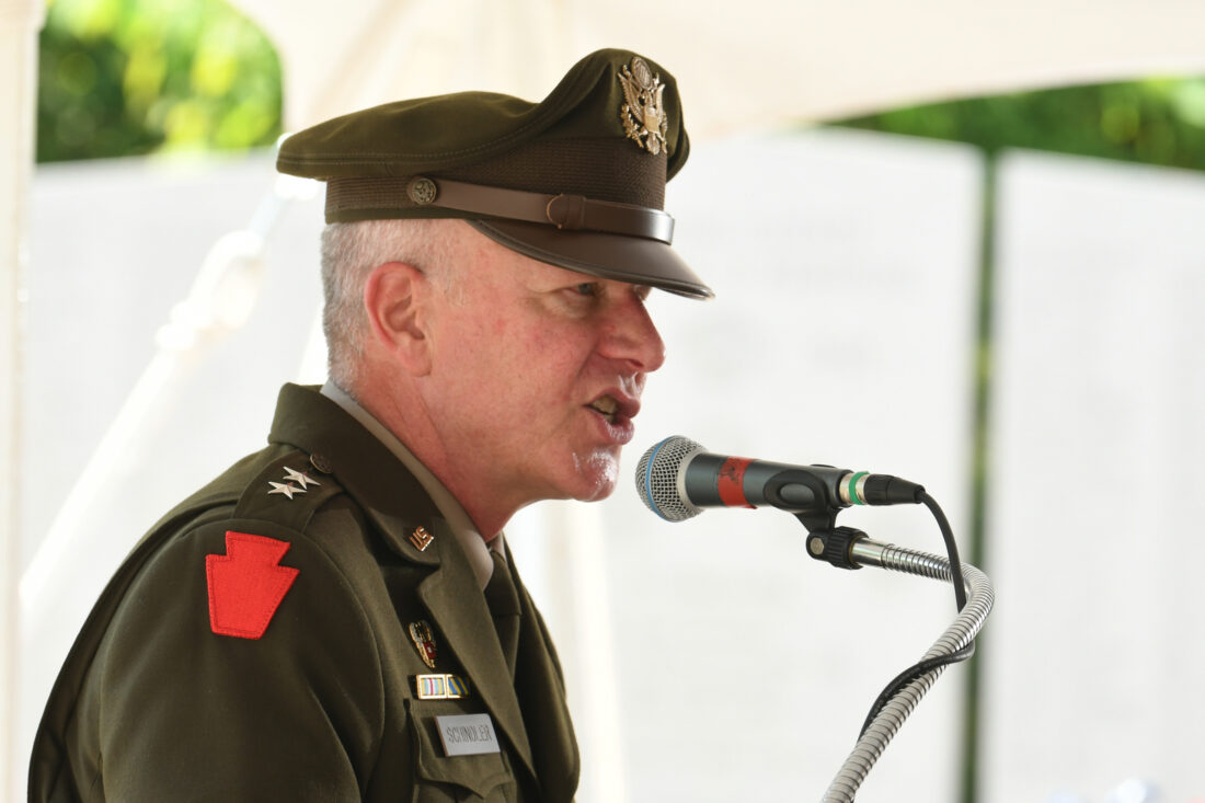 RALPH WILSON/Sun-Gazette Correspondent MG. Mark J. Schindler, Adjunct General of Pennsylvania, addresses the crowd during the annual Memorial Day service at Lycoming County Veterans Park on Saturday, May 25, 2024.