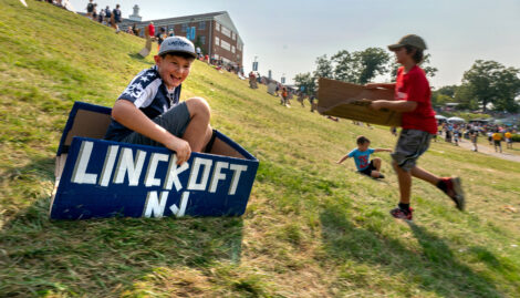 - Connor Chang of Lincroft NJ laughs as he slides down the hill in the outfield at Lamade Stadium in his custom cardboard box the “Jersey Slide” during the game Thursday afternoon. DAVE KENNEDY/Sun-Gazette