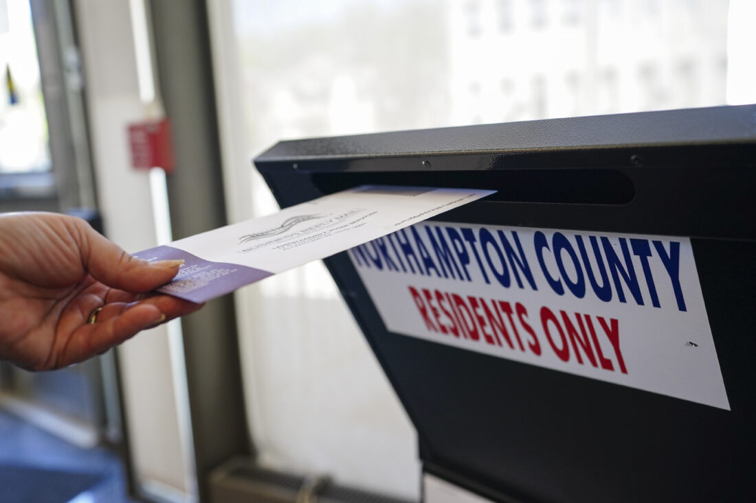 A voter puts a ballots into a drop box April 23, 2024, at Bethlehem City Hall in Bethlehem, Northampton County, Pennsylvania. (Matt Smith / For Spotlight PA)