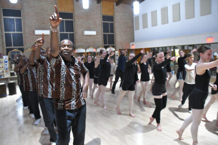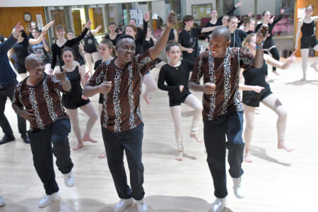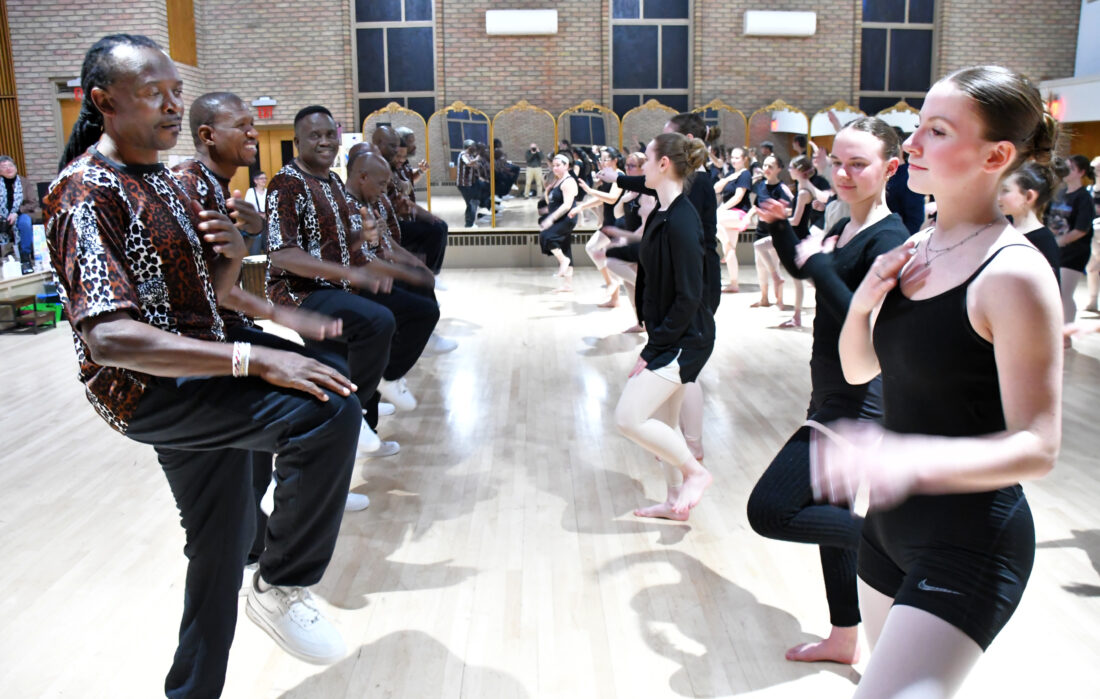 - MARK NANCE/Sun-Gazette Correspondent Members of Thula Sizwe teach one of their song and dances to ballet classes at St. John’s School of the Arts (SOTA) Monday night. Thula Sizwe, meaning “hush and listen,” is a ten-man group from Soshanguve South Africa is a singing and dancing troupp. The group uses a call-and-response acapella style called isicathamiya, or “walk softly,” originating from tribal performances from the the 20th century. Thula Sizwe is traveling the U.S. with Williamsport/Loyalsock native Lee Saville-Iksic, Artistic Director of the Pittsburgh Youth Chorus and was invited to the school by SOTA Artistic Director Theres Kendall.