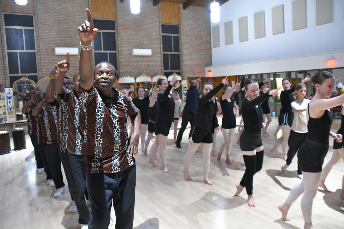 MARK NANCE/Sun-Gazette Correspondent Members of Thula Sizwe teach one of their song and dances to ballet classes at St. John's School of the Arts (SOTA) Monday night. Thula Sizwe, meaning "hush and listen," is a ten-man group from Soshanguve South Africa is a singing and dancing troupp. The group uses a call-and-response acapella style called isicathamiya, or "walk softly," originating from tribal performances from the the 20th century. Thula Sizwe is traveling the U.S. with Williamsport/Loyalsock native Lee Saville-Iksic, Artistic Director of the Pittsburgh Youth Chorus and was invited to the school by SOTA Artistic Director Theres Kendall.