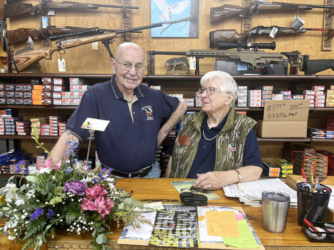BREANNA HANLEY/The Express Above, Philip “Phil” and Janet “Jan” Miller are pictured behind the counter at Miller’s Gun Shop in Mill Hall, which is celebrating its 60th anniversary this year.