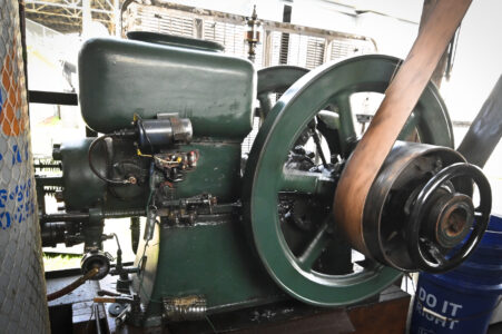 To help produce his ice cream, Johnson uses a system known as a hit and miss engine, a type of engine popular for stationary agricultural machinery that fires only when operating at, or below a set speed.