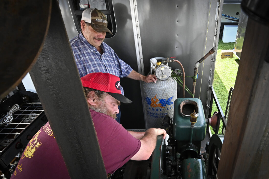 RALPH WILSON/Sun-Gazette Correspondent Darrell Travelpiece tugs on the flywheel of a hit & miss engine as Scott Johnson waits for it to catch. The five horsepower, 1925 Hercules engine supplies the muscle for up to five ice cream churns in Johnson's customized trailer. The resulting frozen treat is available in numerous flavors from Scott and his wife Glenda at the Lycoming County Fair.